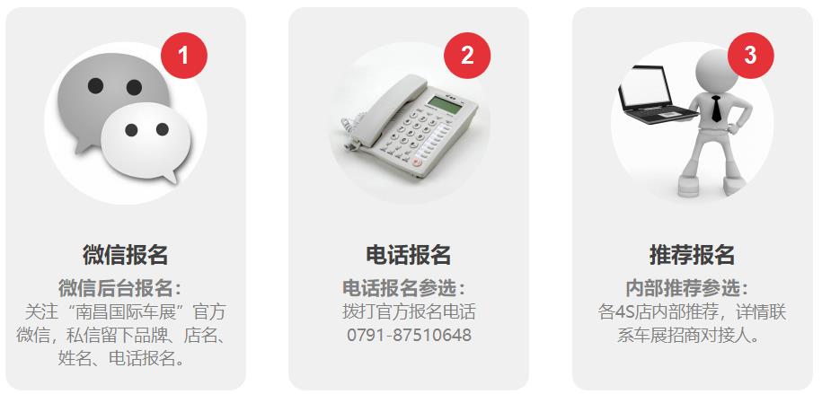 即日起至9月9日(截止時間9月9日下午17:00),各品牌汽車4S店的汽車銷售代表只需關注“南昌國際車展”官方微信,后臺發(fā)送報名信息或撥打電話0791—87510648進行報名,還可以由各大汽車品牌單位內(nèi)部評選推薦報名 。