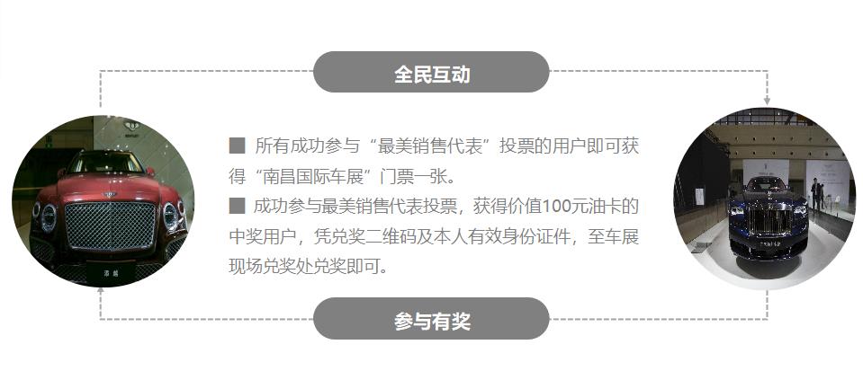 廣大市民的投票方式也非常簡單,在9月10日—9月30日(截止時間9月30日12:00)這段時間內(nèi),通過登錄南昌國際車展官網(wǎng)或關注“南昌國際車展”官方微信,選擇“最美銷售”即可為心儀的銷售代表投票,每人每天有5次投票權(quán),最終以線上得票多少評出“最美銷售代表。并且,所有參與投票的朋友們在投票后分享鏈接即可參與分享贏油卡活動,中獎用戶即可獲得價值100元油卡一張!